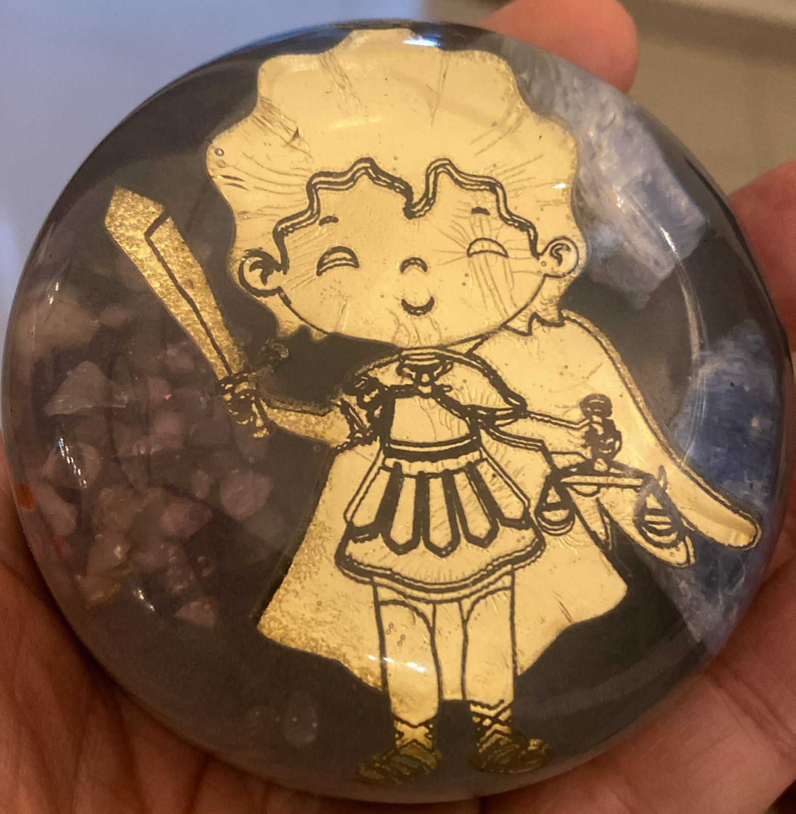 Essa Orgonite é fosforescente e traz uma luminosidade discreta no escuro.